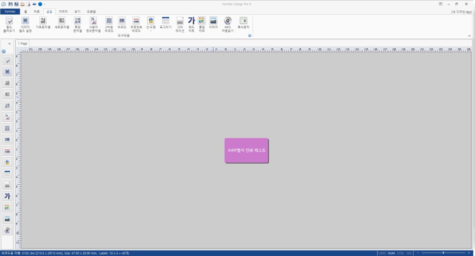 알맞은 규격을 선택하신 후 좌측의 용지를 클릭하시고 상단 탭 메뉴의 '삽입'을 눌러주시면 라벨 디자인 시 활용할 수 있는 여러 메뉴들이 활성화가 됩니다. <가로문자열>이 보편적으로 사용되는 문자열의 형태이며, 세로는 세로로 쓰이는 문자열입니다. 여기서 <확장 문자열>은 글꼴과 정렬, 문자 색 등을 변경할 수 있는 메뉴입니다.