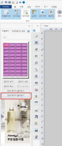 디자인 확인 후 전체 칸에 적용을 하기 위해 상단 메뉴 탭에 '보기' - <라벨용지창>을 순서대로 클릭해주세요! 그 다음 미리보기 창 하단에 위치한 <전체페이지 붙여넣기>를 클릭해주시면 모든 칸에 디자인이 적용된 것을 확인하실 수 있습니다.